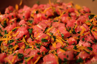 今日のお夕飯は、牛刺しに人参とケールを少し混ぜました。